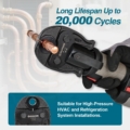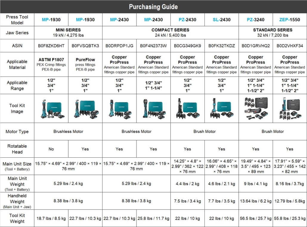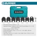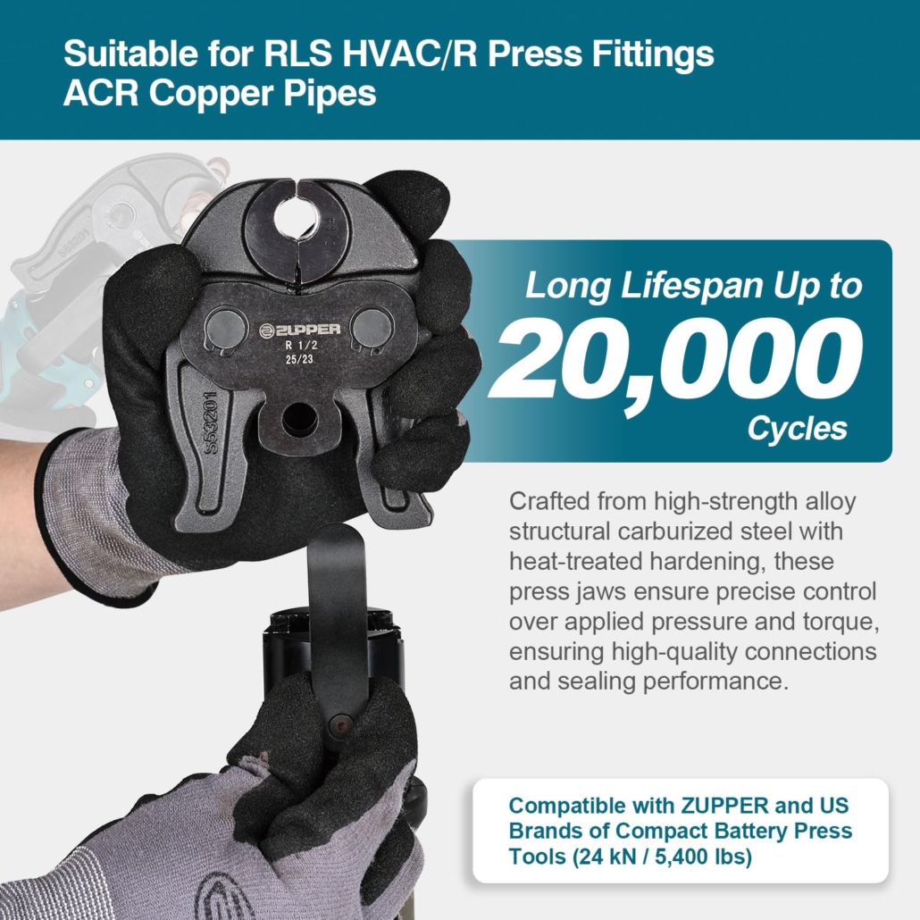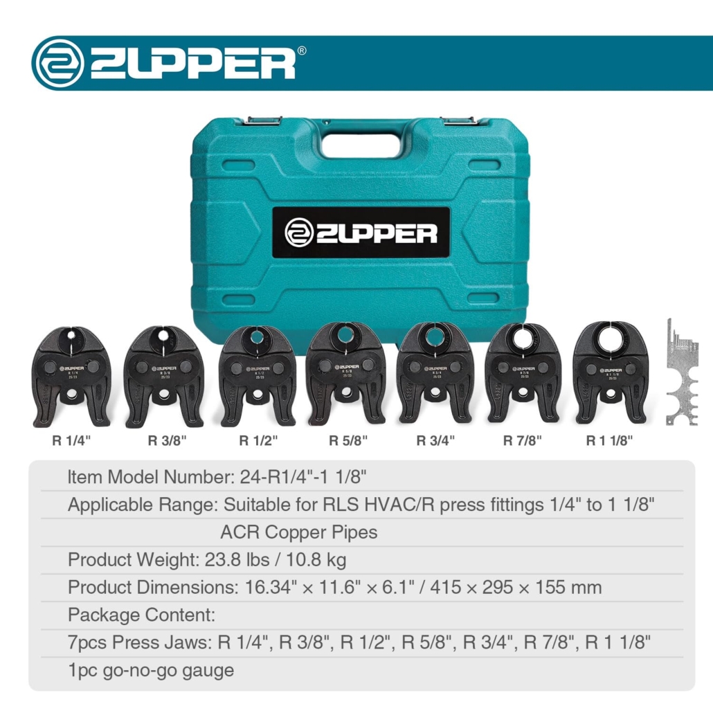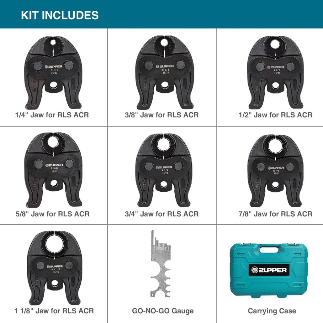 ZUPPER Compact Jaws Kit includes a carrying case, go‑no‑go gauge, and 7 press jaws: 1/4″, 3/8″, 1/2″, 5/8″, 3/4″, 7/8″, and 1 1/8″. Designed for RLS press fittings and ACR copper pipes, it delivers reliable connections for high‑pressure HVAC and refrigeration systems. These hardened carburized steel jaws support up to 20,000 press cycles and are compatible with 24kN compact press tools such as ZUPPER MP‑2430, PZ‑2430, SL‑2430, and US-brand DCE210, RP 240, RP 241, RP 251, and M12 FORCE LOGIC models. All items are stored in a durable PE case for job site portability. Note: Not compatible with RP 115, ZUPPER 1550, 3240, or 1930. Refer to the compatibility chart for proper tool matching.