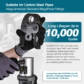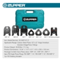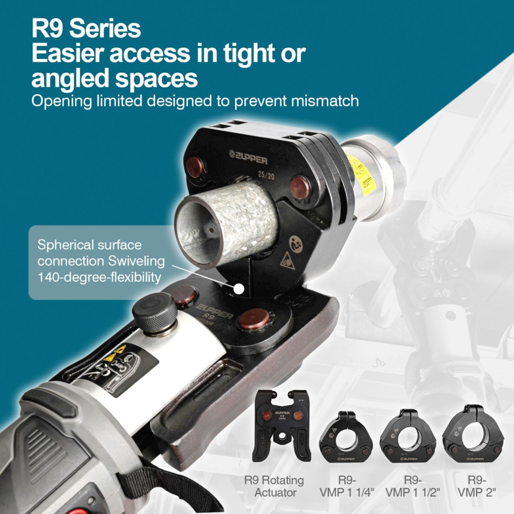ZUPPER 1/2″ to 2″ MegaPress Pressing Kit includes a sturdy carrying case, three VMP jaws (1/2″, 3/4″, 1″), three R9 rings (1 1/4″, 1 1/2″, 2″) and one R9 actuator. Designed for carbon steel pipe and American Standard MegaPress fittings, it is compatible with ZUPPER and major US brand 32kN standard press tools including PZ-3240, PZ-1550, EB-1550, DCE200, RP 340, RP 350, RP 351 and M18 FORCE LOGIC models. The R9 ring-and-actuator assembly features a spherical joint supporting 140° rotation for easy access in confined spaces, with an opening limit to avoid mismatching. Made from hardened high-strength alloy steel, these jaws deliver consistent, professional presses rated for 10,000 cycles. All components store neatly in a durable PE case for job site portability. Note: Not compatible with mini or compact series tools such as ZUPPER 1930 and 2430. Please refer to the compatibility chart for correct tool matching.