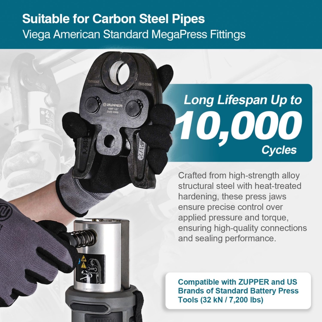 ZUPPER MegaPress Jaws, 1/2″ to 2″ Standard Pressing Jaws and Rings Kit for Carbon Steel Pipes, Compatible with Standard Press Tools (32 kN / 7,200 lbs) – with Carrying Case