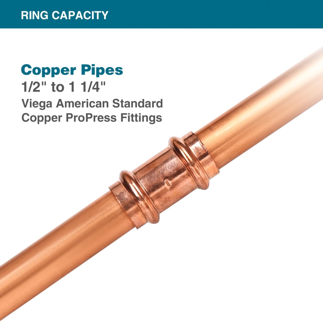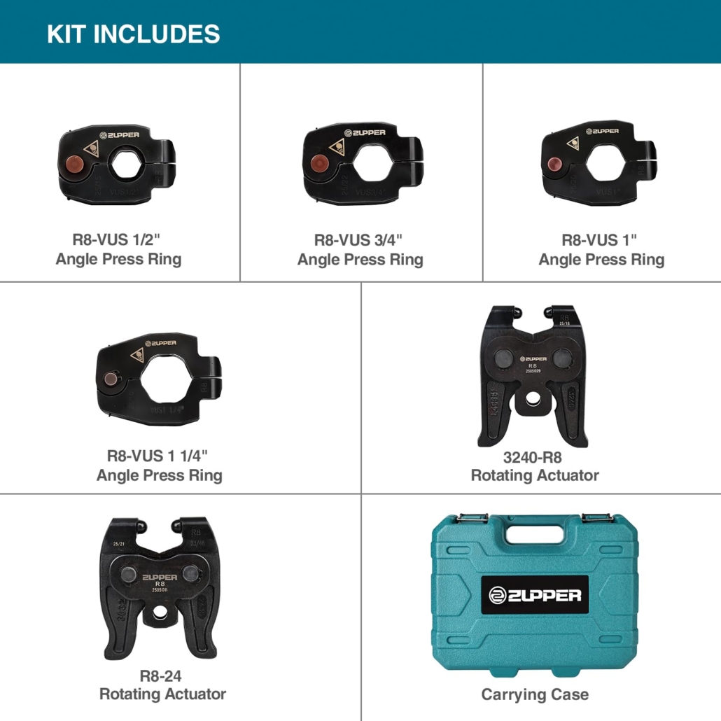 • ZUPPER 1/2″ to 1-1/4″ Copper Pro Press Rings Kit: Includes carrying case, four R8 angle press rings: R8-VUS 1/2″, R8-VUS 3/4″, R8-VUS 1″, and R8-VUS 1 1/4″, two R8 rotating actuators: R8-24, and 3240-R8.