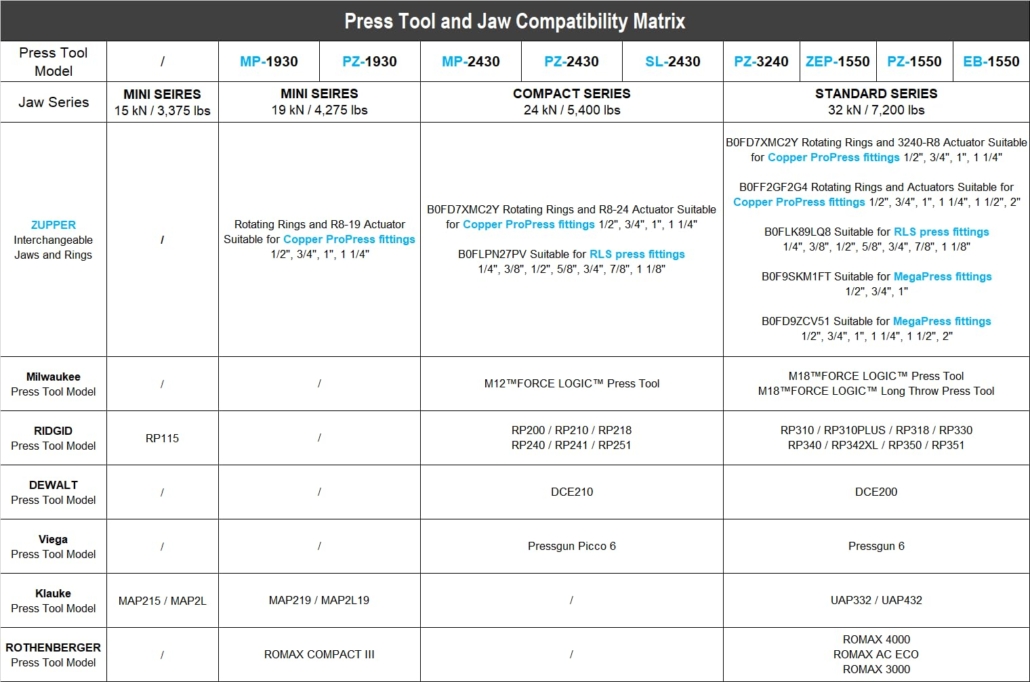 Link to: ZUPPER MegaPress Jaws, 1/2″ to 2″ Standard Pressing Jaws and Rings Kit for Carbon Steel Pipes, Compatible with Standard Press Tools (32 kN / 7,200 lbs) – with Carrying Case Link to: ZUPPER MegaPress Jaws, 1/2″ to 2″ Standard Pressing Jaws and Rings Kit for Carbon Steel Pipes, Compatible with Standard Press Tools (32 kN / 7,200 lbs) – with Carrying Case ZUPPER MegaPress Jaws, 1/2″ to 2″ Standard Pressing Jaws and Rings... Link to: ZUPPER MegaPress Jaws, 3PCS Standard Pressing Jaws Kit 1/2″, 3/4″, 1″ for Carbon Steel Pipes, Compatible with Standard Press Tools (32 kN / 7,200 lbs) – with Carrying Case Link to: ZUPPER MegaPress Jaws, 3PCS Standard Pressing Jaws Kit 1/2″, 3/4″, 1″ for Carbon Steel Pipes, Compatible with Standard Press Tools (32 kN / 7,200 lbs) – with Carrying Case ZUPPER MegaPress Jaws, 3PCS Standard Pressing Jaws Kit 1/2″, 3/4″,...