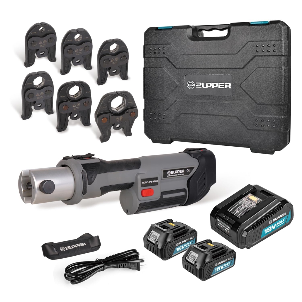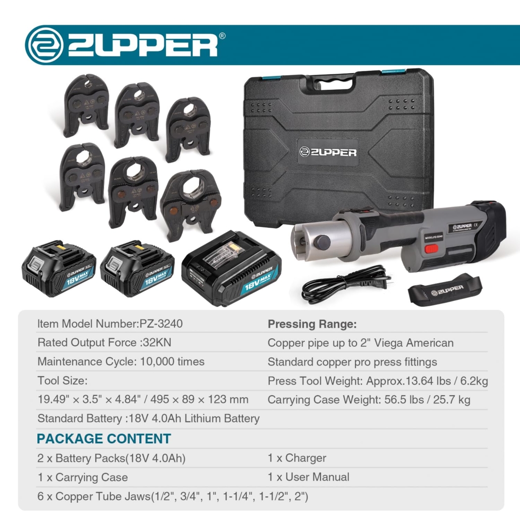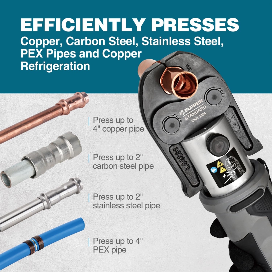 - ZUPPER Standard Press Tool Kit: Includes jaws for copper pipe up to 2″ American Standard copper pro press fittings. (PLEASE NOTE: If you need to press other types of pipe fittings, please purchase the corresponding press jaws separately.) Compatible with ZUPPER and US brands’ Standard Series jaws, rings, and actuators. Tool can press up to 4″ copper pipe, 2″ carbon steel pipe, 2″ stainless steel pipe, 4″ PEX pipe.