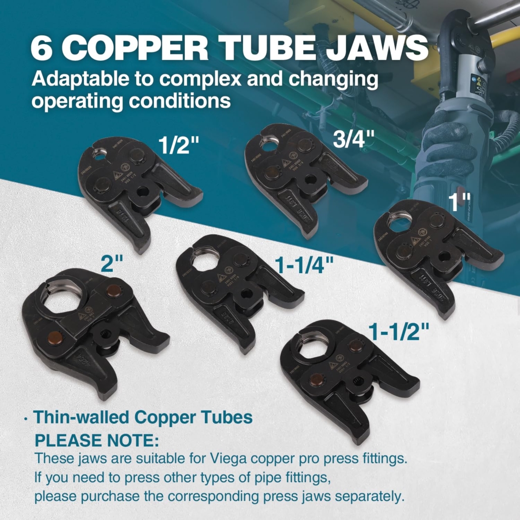 - High-Strength Press Jaws: Crafted from high-strength alloy structural carburized steel with heat-treated hardening, these jaws offer extended pressing lifespan. Safety pin locks jaw in place to prevent unsafe conditions, providing greater operational flexibility and comfort for users.