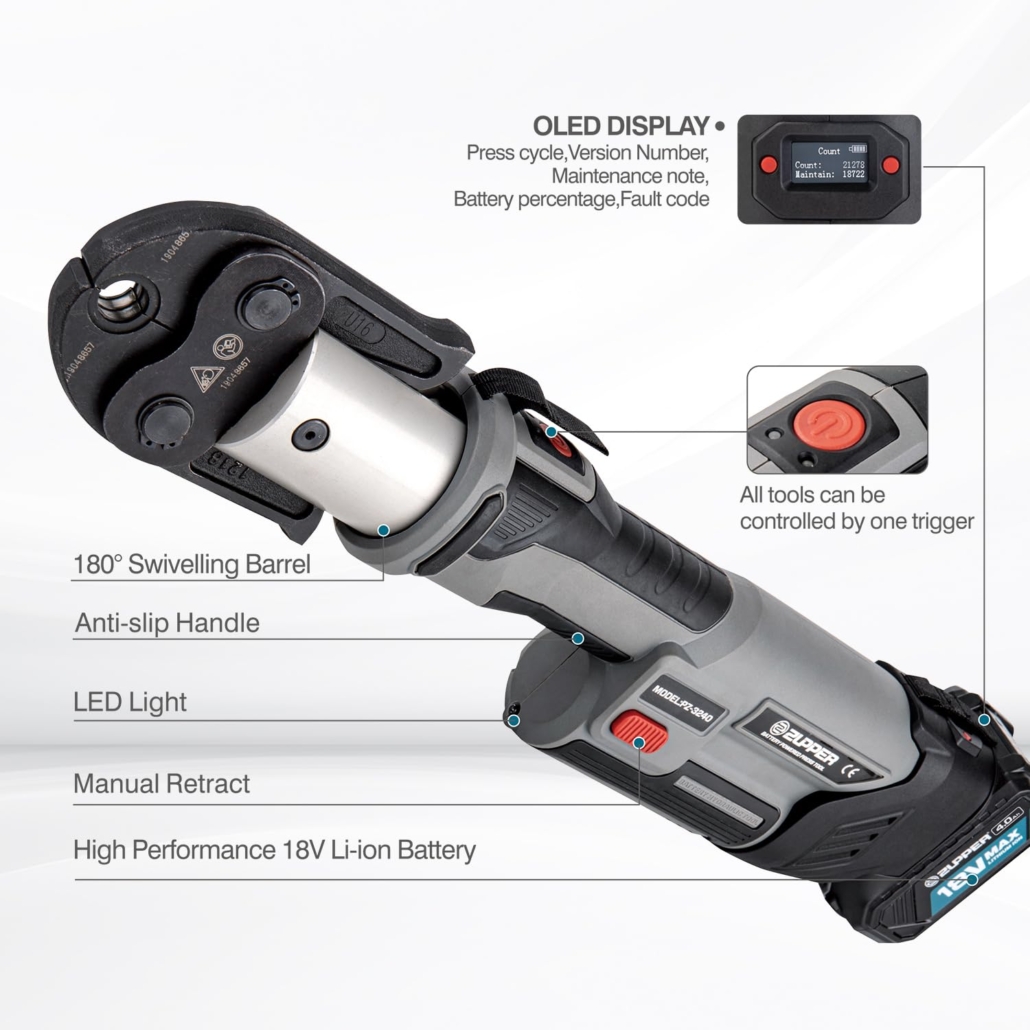 - Convenient Operating Experience: The head design supports 180° rotation, easier access to connections. Ergonomic design and optimized position of centre of gravity for comfortable operation. Electronic control and monitor of pressing operation, automatically completes press cycles, saving time and effort.